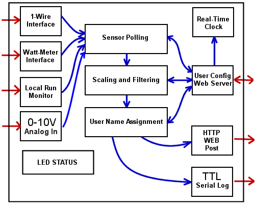 Polling is a pure software function. 1-Wire inputs and Run inputs are polled every six seconds (0.1 Minutes). Power meter inputs are accumulated every 60 seconds. Raw input values are stored for further processing. The current sensor values are available for instant viewing via the local web server. If a "found" sensor does not respond during polling, or fails to return a valid value, it's status is set to "invalid" which prevents it's data from being posted.